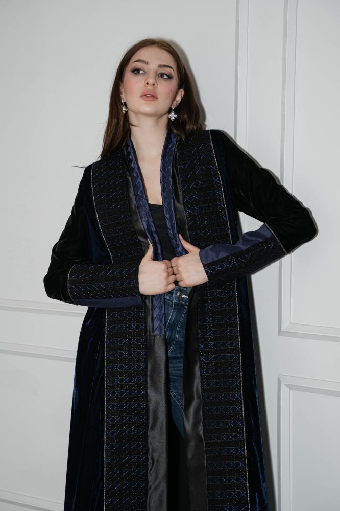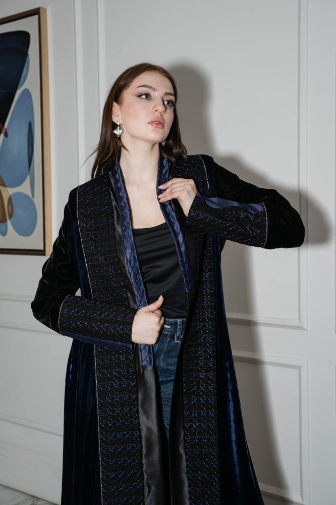 عباية مخمل فاخرة بتدرجات الكحلي والأسود، مصممة بلمسة عصرية تجمع بين الفخامة والراحة اليومية.