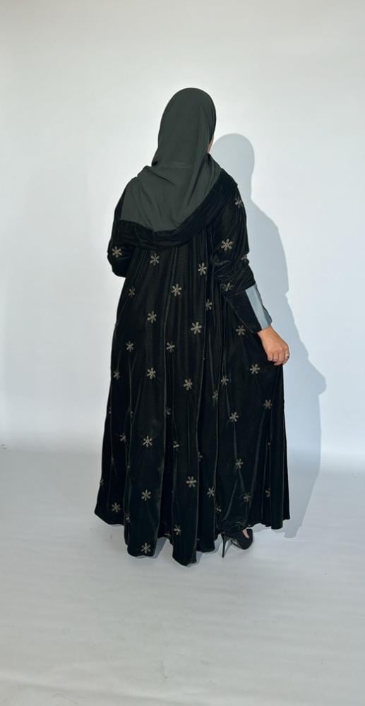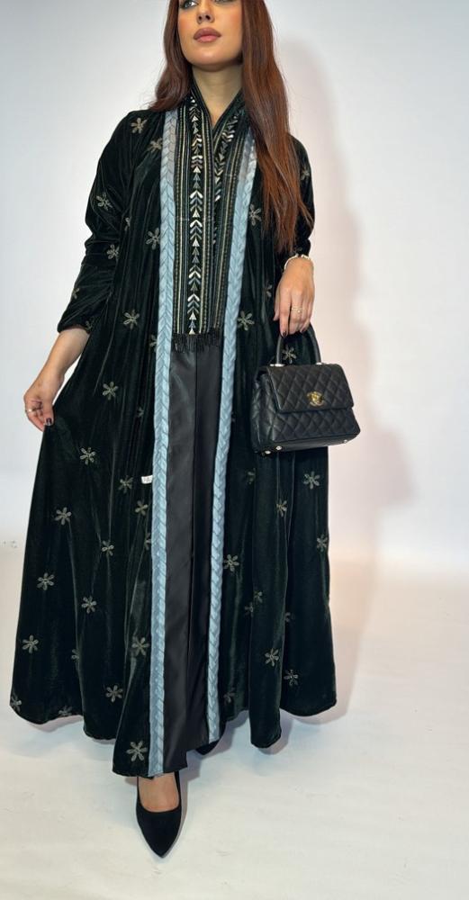 عباية مخمل فاخرة باللون الزيتي مطرزة بالكامل بقصّة كلوش انسيابية تمنح إطلالة ملوكية وحضوراً راقياً.