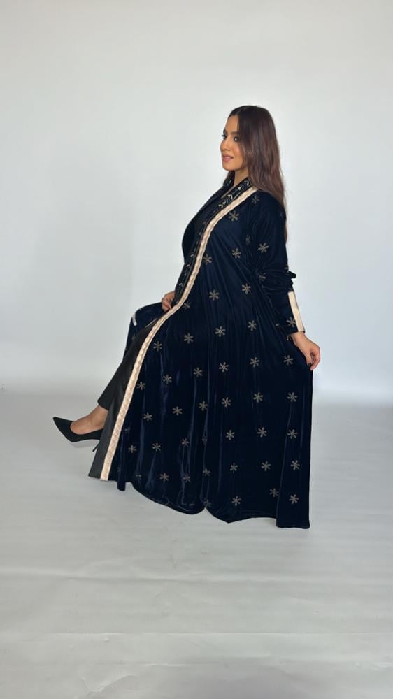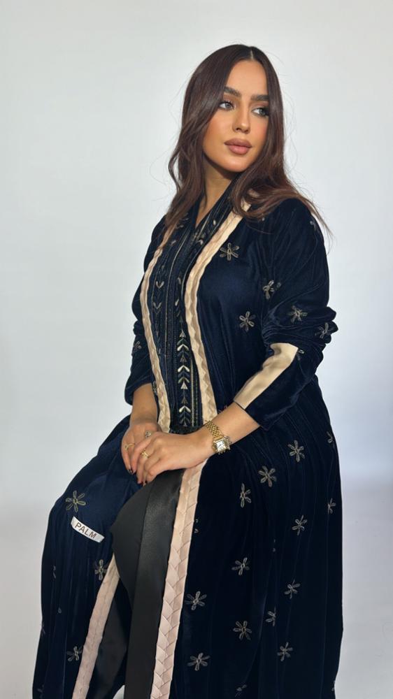 - مصنوعة من مزيج من المخمل الياباني الناعم وقماش التفته الأنيق، وهو مزيج يجعل العباية مريحة ودافئة في الأجواء الشتوية.